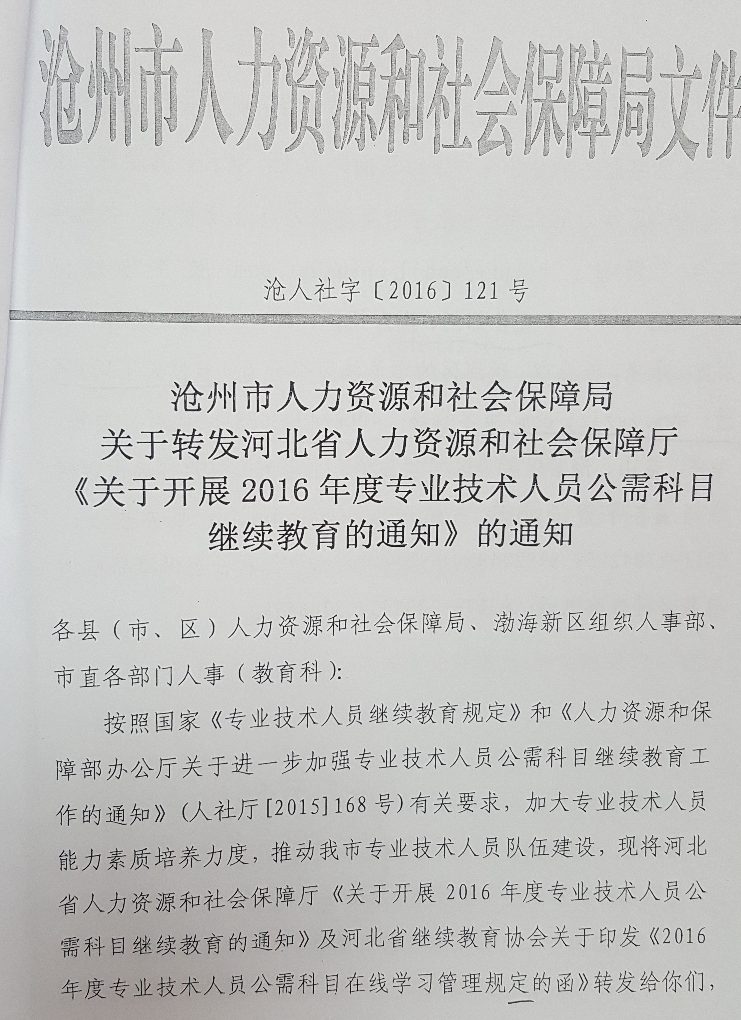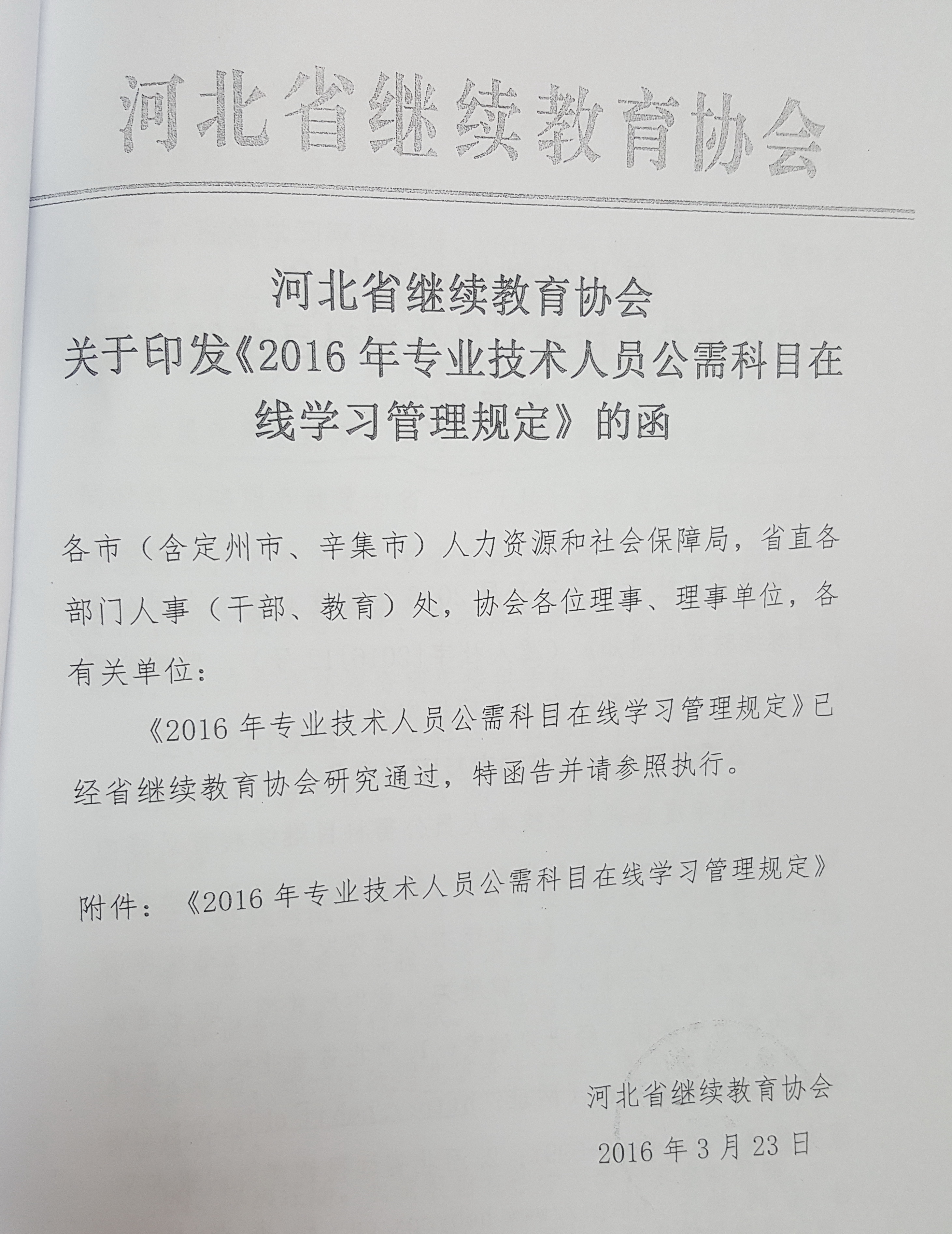 关于开展2016年度专业技术人员公需科目继续教育的通知