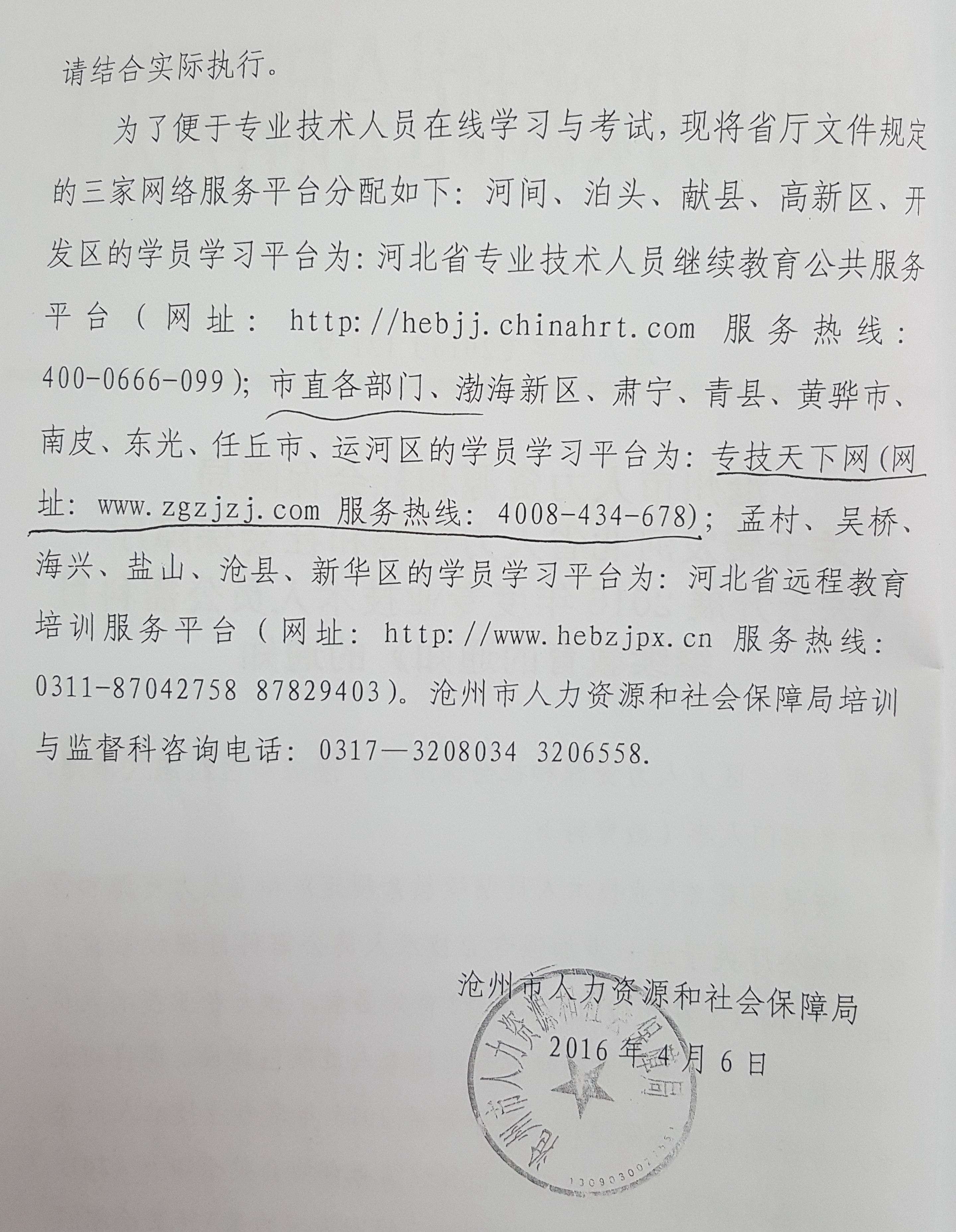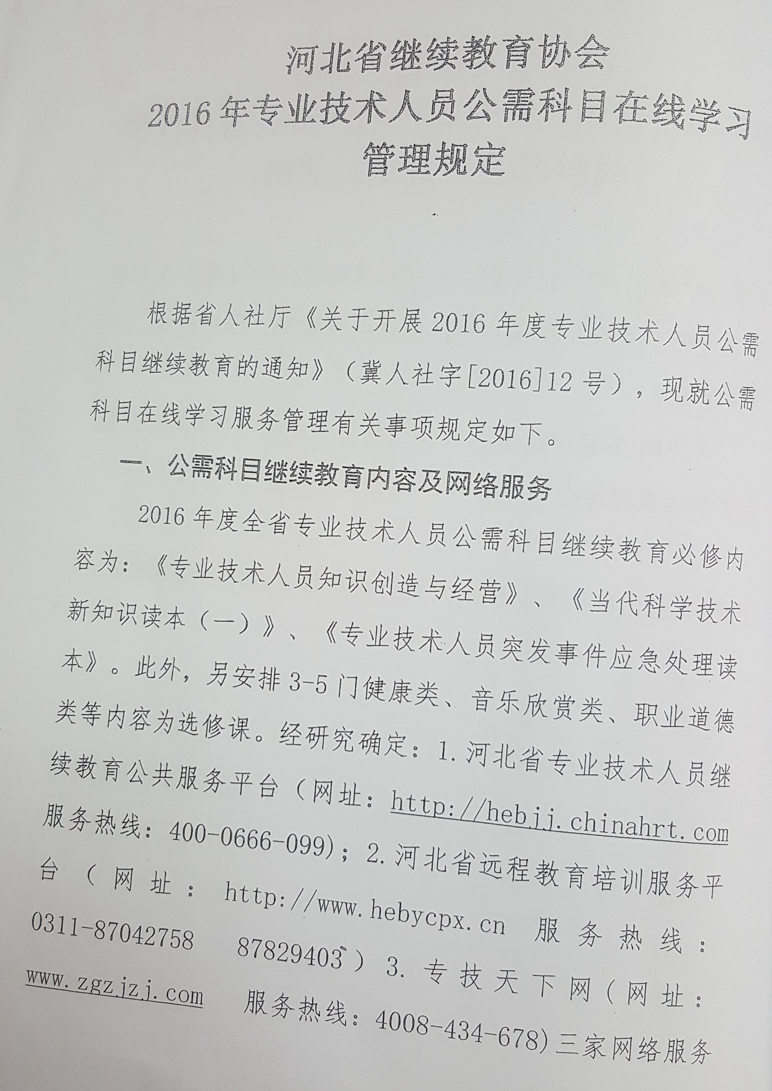 (三)组织管理。为充分发挥河北省继续教育协会在联系会员和会员单位、宣传继续教育工作、推动继续教育信息沟通、理论研究、对内对外交往等方面的重要作用,从2016年开始,公需科目继续教育组织管理工作委托河北省继续教育协会全程管理和运作。为保证管理工作的公平、公正、公开,经与协会广泛沟通,2016年推荐三家网络服务平台作为开展公需科目培训的服务商。1.河北省专业技术人员继续教育公共服务平台(网址:http://hebjj.chinahrt.com服务热线:400-0666-099);2.专技天下网(网址:www.zgzjzj.com服务热线:4008-434-678);3.河北省远程教育培训服务平台(网址:http://www.hebzjpx.cn服务热线:0311-87042758 87829403)。学员可在推荐的三家网站中选择一家进行学习,年底经主管部门考察并参考学员反映,确定最佳服务网站,作为今后公需科目培训主要服务商。