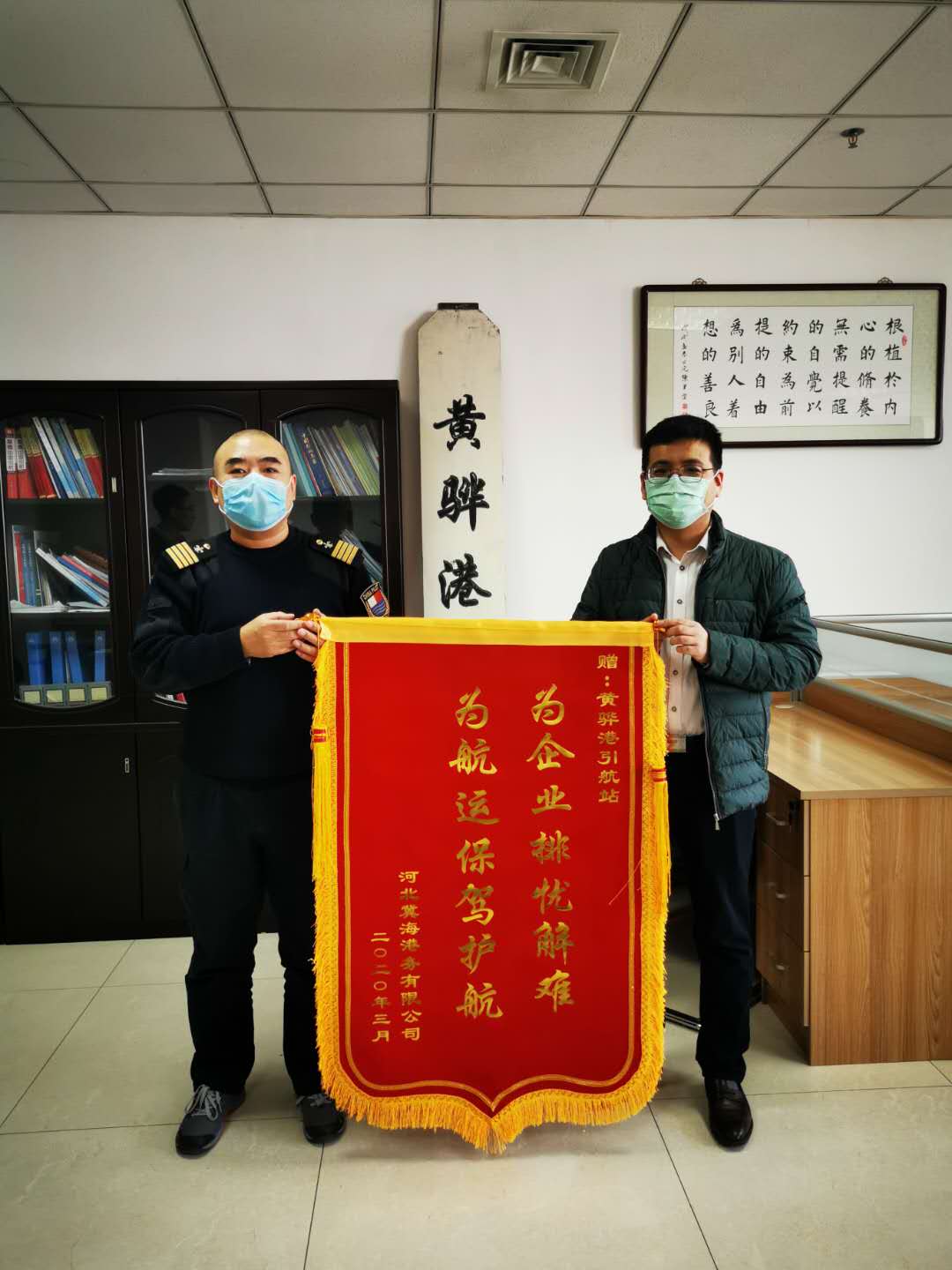 3月18日上午,河北冀海港务有限公司给黄骅港引航站送来了锦旗,对疫情期间我站为企业排忧解难,为航运保驾护航所做的工作表示感谢。