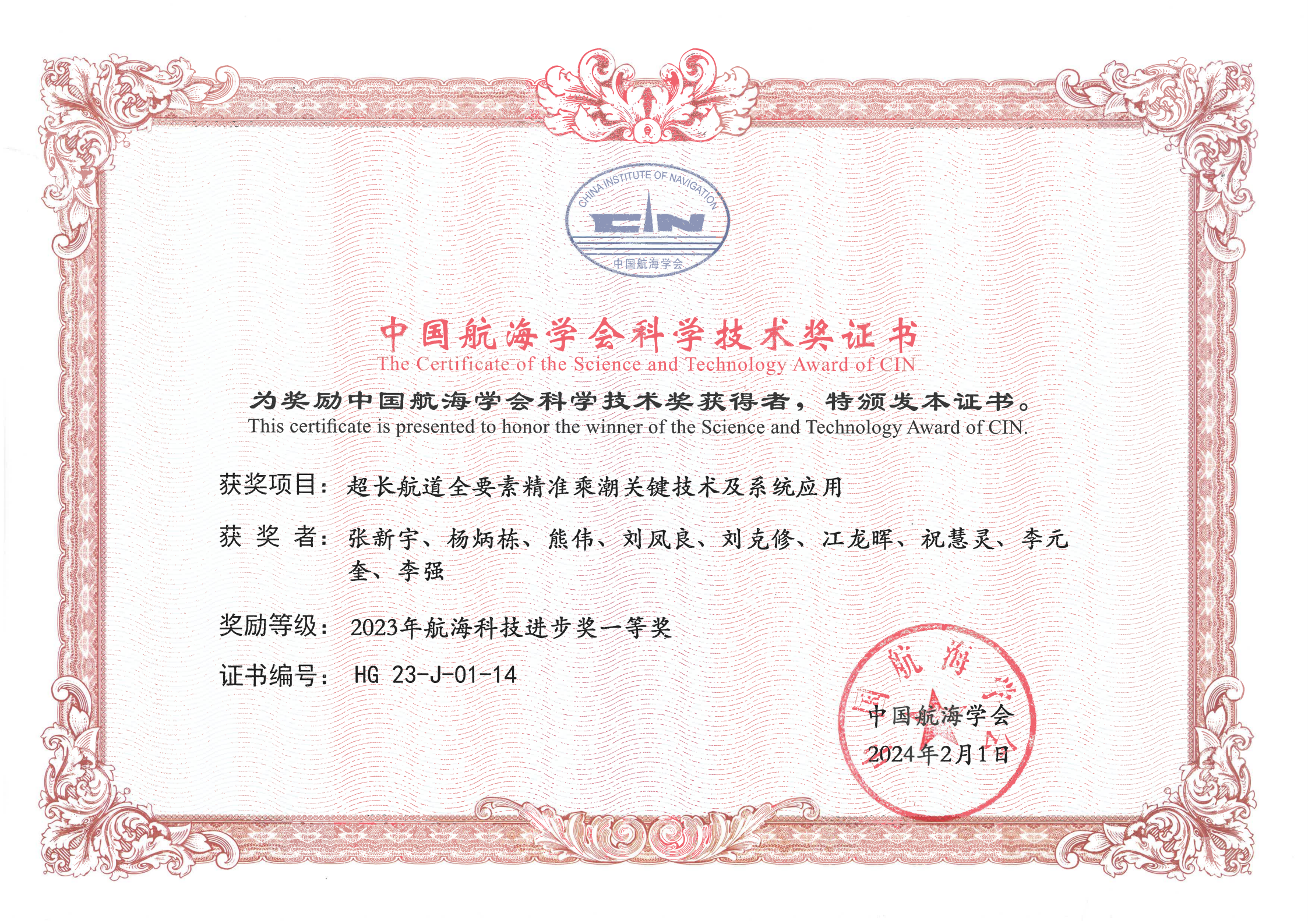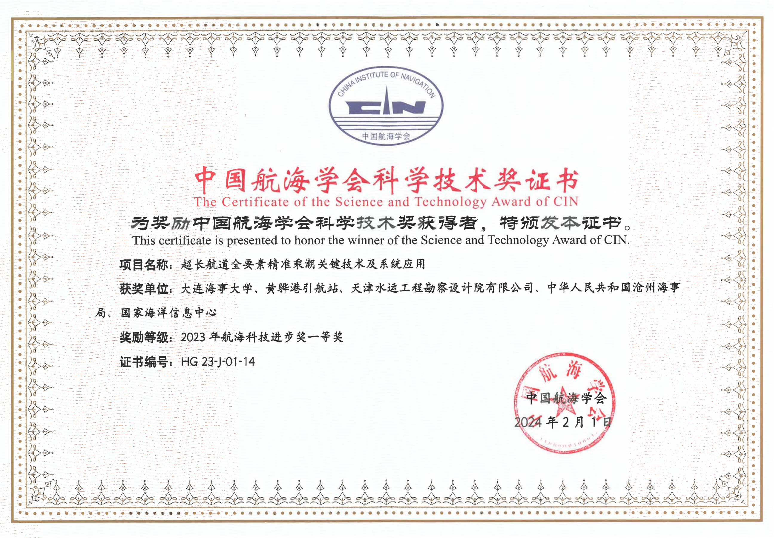 该研究成果,节约了港口设施投入成本,提升了通航能力,保障了港口安全,为港航企业创造了巨大的经济效益。同时该项目也填补了行业空白,是国家智能航运战略的基础组成部分,具有重要的科技价值和推广价值。2023年“超长航道全要素精准乘潮关键技术及系统应用”项目通过中国航海科技评价,评价标准为国际领先,荣获2023年中国航海学会航海科技进步奖一等奖。