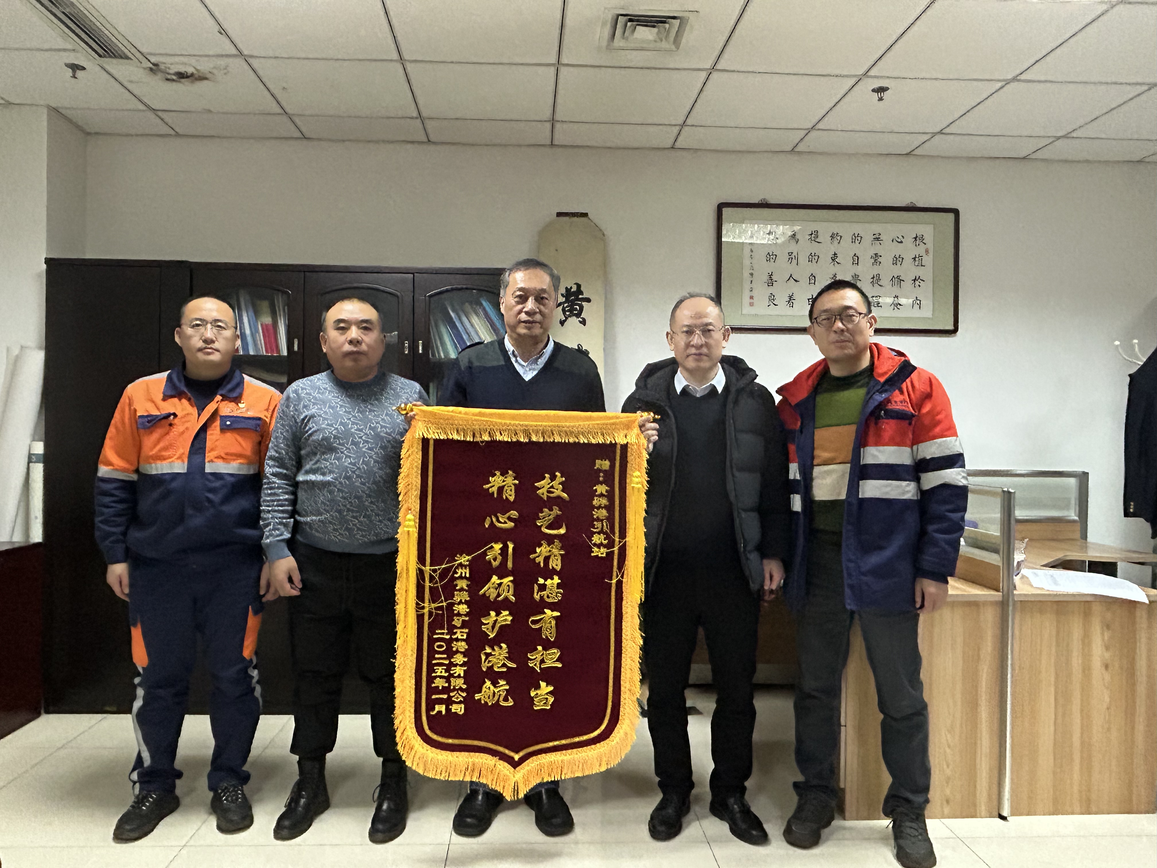 1月8日下午,我站收获了沧州市黄骅矿石港务有限公司送来的锦旗,熠熠生辉的旗面书写着“技艺精湛有担当、精心引领护港航”字样,公司副总李渊龙一行三人与站领导谢春华、刘树谦亲切交谈。